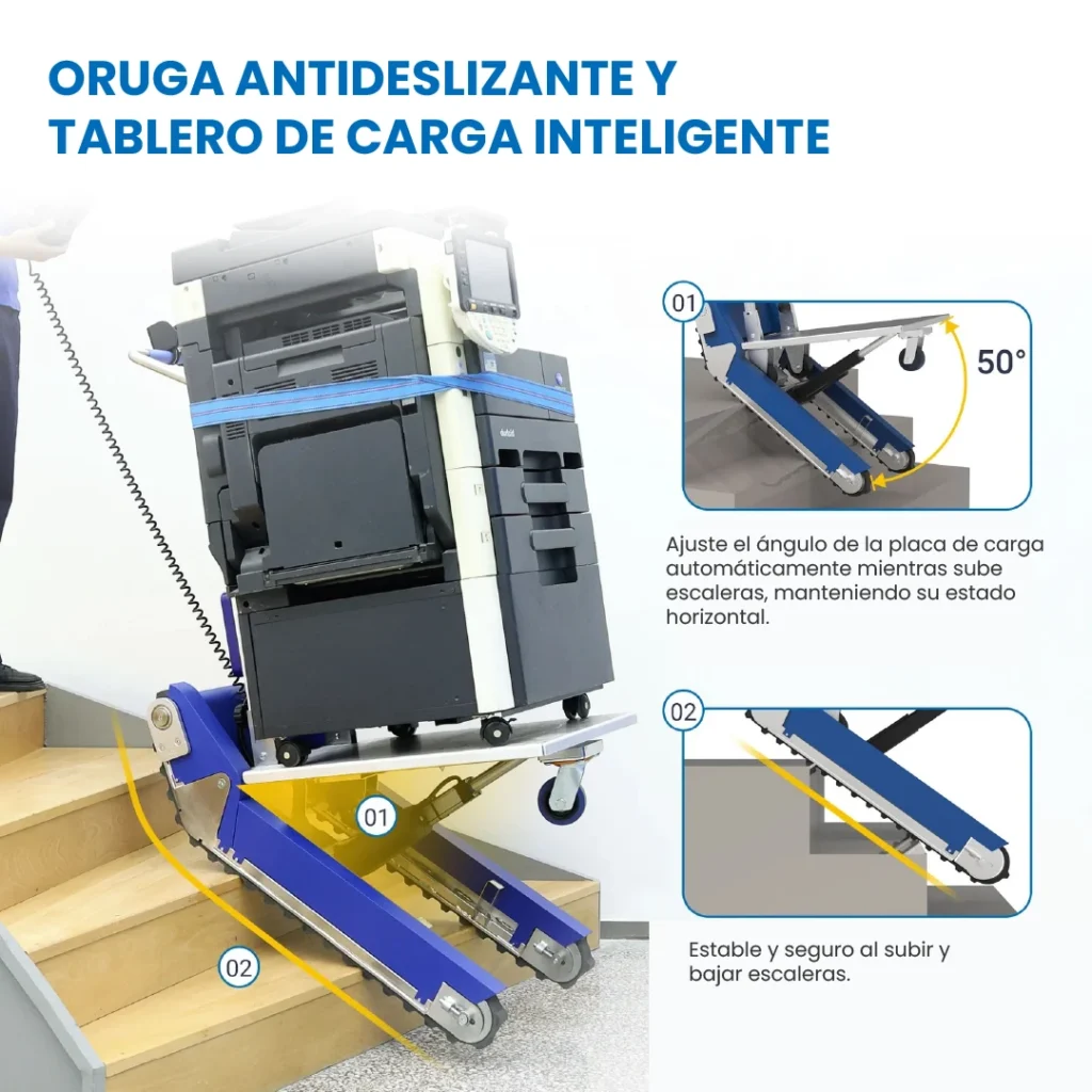 El XSTO CT310 es un sube escaleras eléctrico de oruga diseñado para facilitar el transporte de cargas pesadas en escaleras. Entre sus mejoras destacan dos motores potentes, orugas independientes antideslizantes que no dejan marcas, y un tablero de carga inteligente que se adapta automáticamente al ángulo de las escaleras. Su batería de litio recargable y portátil proporciona un funcionamiento silencioso, permitiendo subir hasta 100 pisos con una sola carga. Además, incluye un control remoto por cable y un joystick de manejo sencillo con un dedo. Su capacidad máxima de carga es de 310 kg.